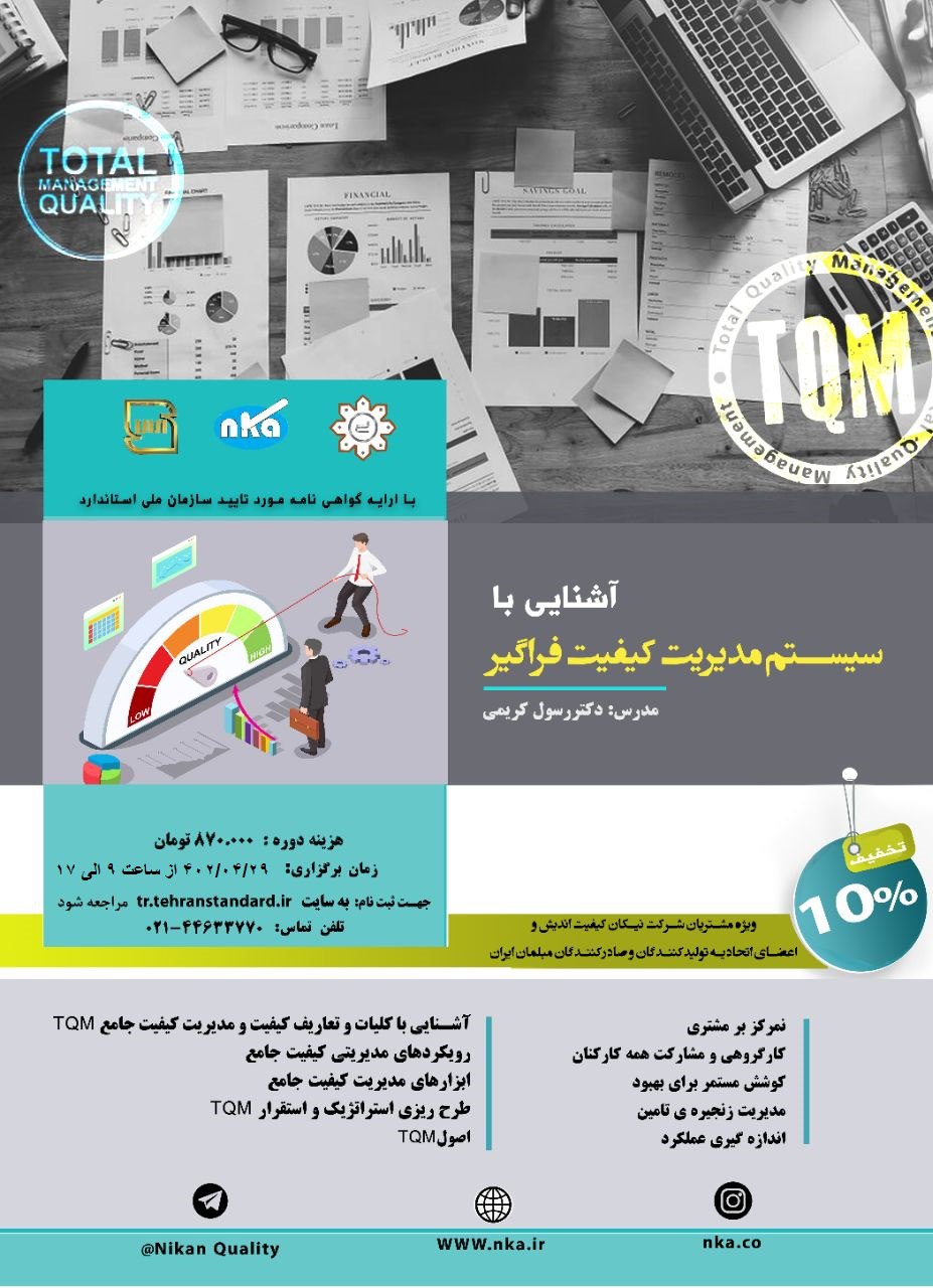 دوره مدیریت کیفیت فراگیر توسط اتحادیه تولیدکنندگان و صادرکنندگان مبلمان با تاییدیه سازمان ملی استاندارد با همکاری شرکت نیکان کیفیت اندیش برگزار می گردد. استاد دوره جناب دکتر کریمی عضو هیئت علمی دانشگاه آزاد اسلامی می باشد . در این دوره با اصول مدیریت کیفیت فراگیر و و پیاده سازی آن آشنا خواهید شد.