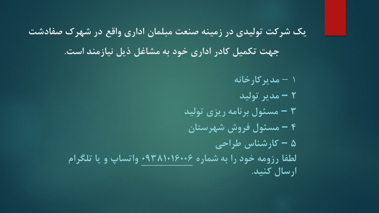 شرکت فرامین تولید کننده میز های اداری نیاز به نیرو با تخصص های ذیل دارد لطفا رزومه خود را به شماره 09371016006 واتس آپ نمایید.